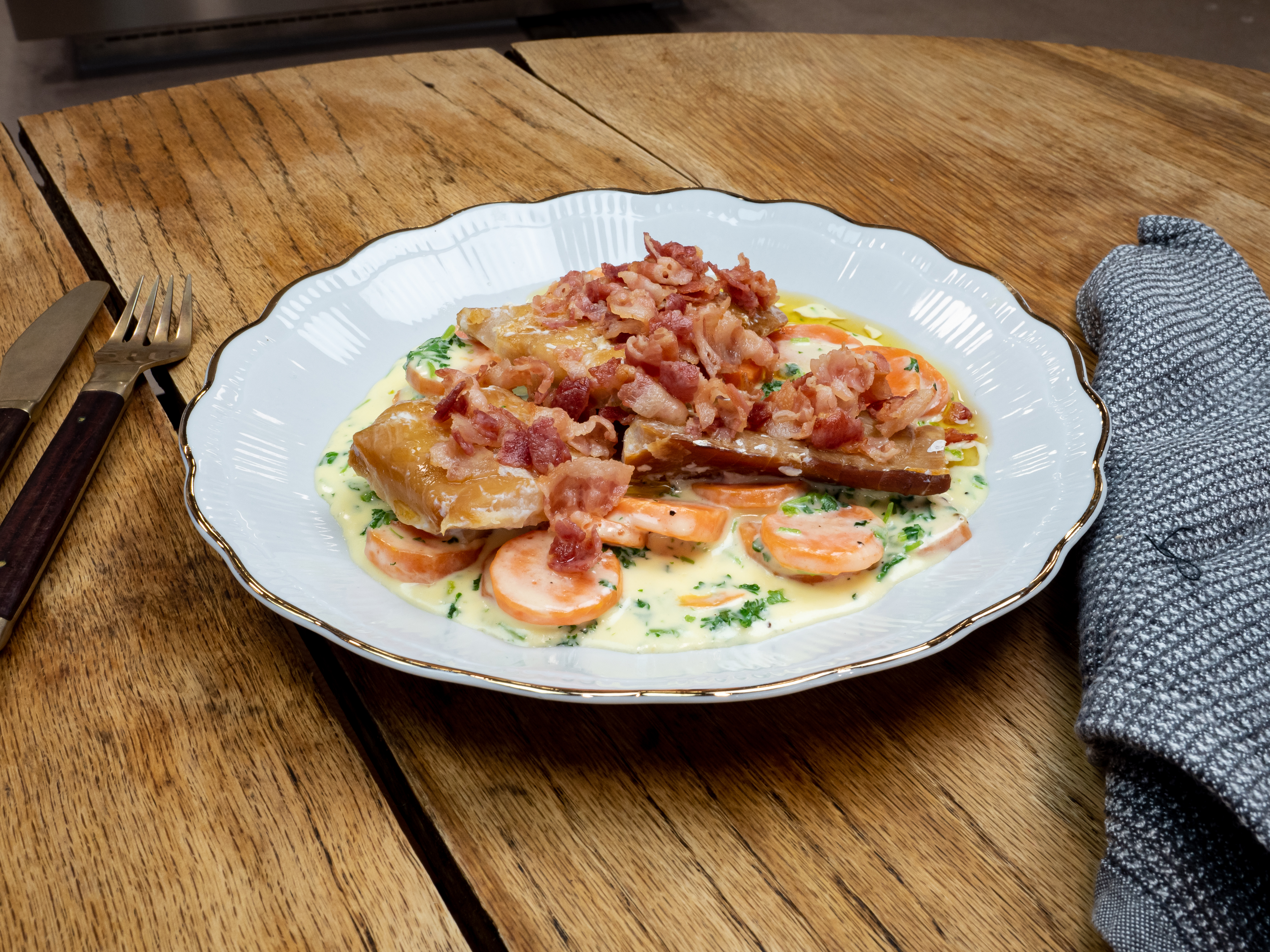 - Vend fisken forsiktig inn i potetblandingen og server med smeltet smør og vårløk